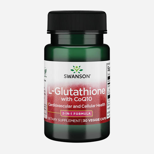 Vegetarische L-glutathion capsules met CoQ10 van Swanson. Een capsule levert maar liefst 200 mg L-glutathion en 100 mg van CoQ10.