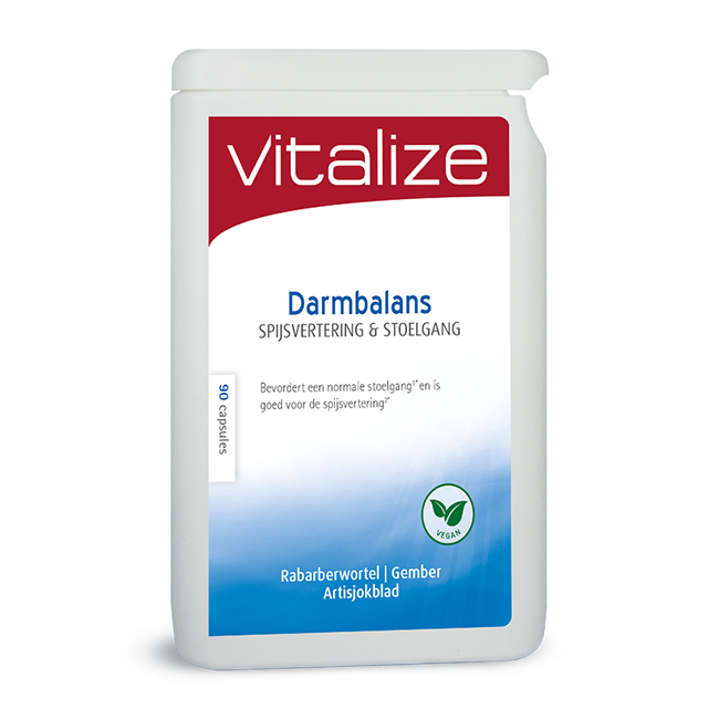 Vitalize Darmbalans Stoelgang is een samengesteld supplement op basis van enzymen, probiotica en natuurlijke vruchten- en plantenextracten. Deze helpen het lichaam bij het spijsverteringsproces en dragen bij aan een evenwichtige stoelgang. Rabarberwortel in dit supplement draagt bij aan een goede darmwerking en ondersteunt een gezonde blaasfunctie. Betaïne hydrochloride Betaïne hydrochloride is toegevoegd waardoor de opname van de nutriënten bevorderd wordt. DigeZyme® DigeZyme® is een complex van meerder enzymen. Het bestaat uit de enzymen Amylase, Protease, Cellulase, Lactase, Lipase en Beta-D-Galactosidase. Papaja extract Papajaextract helpt het vetgehalte in het lichaam te verlagen. Rabarberwortel: * draagt bij aan een goede darmwerking; * ondersteunt een gezonde blaasfunctie; * helpt bij overgangsklachten; * ondersteunt het afweersysteem. Artisjokblad: * draagt bij aan een goede blaasfunctie; * is goed voor de nierfunctie en urinewegen; * heeft een positieve invloed op lever en galblaas; * bevordert de spijsvertering; * draagt bij aan een verantwoord cholesterolgehalte. Gemberwortel: * ondersteunt het immuunsysteem; * ondersteunt het hart; * ondersteunt een gezonde spijsvertering.