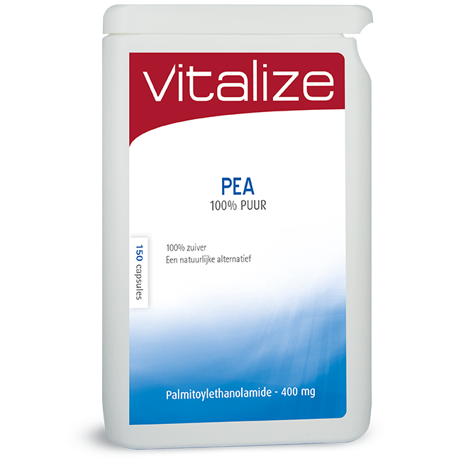Vitalize PEA 100% Puur is een van de nieuwste hoogwaardige voedingssupplementen in het assortiment. PEA (Palmitoylethanolamide) is al in diverse wetenschappelijke studies onderzocht met veel positieve resultaten. Omdat PEA een lichaamseigen stof is gaat het effectief en veilig te werk. Iedere vegetarische capsule bevat 400 mg zuivere Palmitoylethanolamide. Vitalize PEA 100% Puur biedt een topkwaliteit product voor een zeer gunstige prijs. Uitgebreid getest Er zijn veel aanbieders van PEA capsules (supplementen) en deze zijn niet altijd zuiver. Op vragen afkomstig van consumenten en therapeuten heeft Vitalize de PEA capsules uitgebreid laten testen in een wetenschappelijk laboratorium. Hieruit blijkt dat het gaat om 100% zuivere Palmitoylethanolamide zonder toevoegingen van chemische of farmaceutische hulpstoffen in een vegetarische capsule. Om de kwaliteit en zuiverheid van PEA 100% Puur te waarborgen worden de capsules geproduceerd onder de officiële richtlijnen van GMP (Good Manufacturing Practice). Hierdoor wordt Vitalize PEA 100% Puur veel gebruikt en geadviseerd door therapeuten.PEA pure heeft enige tijd nodig om werkzaam te zijn omdat het op een natuurlijke en biologische manier in het lichaam werkzaam is.Eventueel zijn de PEA capsules te combineren met PEA crème.