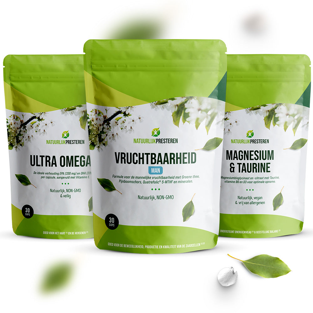 Een inactieve, ongezonde leefstijl kan de vruchtbaarheid van een man verminderen. Ook voedingµnutriënten zijn belangrijk voor de mannelijke vruchtbaarheid. Dit Vruchtbaarheid Man pakket ondersteunt de gezondheid en kwaliteit van de zaadcellen en is goed voor de doorbloeding in de zaadballen. Vruchtbaarheid man (30 caps) – Goed voor de productie en kwaliteit van de zaadcellen en bevat de belangrijkste nutriënten in actieve vorm voor een gezonde fertiliteit. Ook ondersteunt dit product de doorbloeding in de teelballen. Magnesium&Taurine (60 tabletten)– Ons topkwaliteit magnesium supplement met o.a. Magnesium bisglycinaat en -citraat. Magnesium helpt bij de aanmaak van serotonine, is goed voor de nachtrust en helpt in tijden van stress. Ultra Omega-3 (30 caps) – Omega-3 vetten zijn goed voor de kwaliteit van de zaadcellen. Het merendeel van de populatie krijgt onvoldoende omega-3 vetten binnen uit voeding. Dit pakket is samengesteld door onze interne specialist en tevens biobased chemicus. Onder de kopjes ingrediënten, gebruik en reviews vind je meer informatie over dit supplementen pakket. Ook kun je naar de individuele productpagina’s gaan van deze producten.